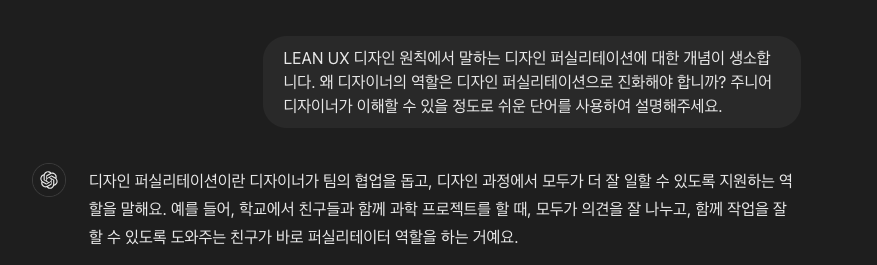 ChatGPT가 말해준 디자인 퍼실리테이터가 하는 일에는 크게 의견 나누기, 문제 해결, 소통 관리가 있었다. 돌이켜서 생각해보니 나는 이미 이 세가지 일을 하고 있다. 예를 들자면 이런 것이다. 자사의 제품 안에서 탭의 이름을 변경하고자 할 때에도 메신저에서 모두가 볼 수 있는 채널에서 이야기를 하고 의견을 구한다. 문제 해결의 경우도 작업 중에 막히는 부분이 있다면 FE 개발자와 의견을 주고 받으며 해결 방안을 찾기 위해 노력한다. 나와 다른 시야를 가진 동료가 있어서 이런 문제를 해결할 때에는 든든하다. 소통 관리 같은 경우는 사업부에서 말하는 고객사의 VOC나 추가 기능에 대해 개발자들에게 이해 시키기 위하여 업무 별로 담당자를 지정해서 태스크를 만들고 목적과 개선 효과를 분명히 하며 프로젝트를 조율한다.