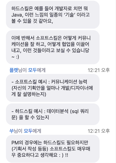 오리엔테이션을 들으면서 모르는 단어나 설명이 더 필요한 부분은 질문하는 즉시 운영진 피클분이 상냥하게 대답해주셨다. 이 날 내가 질문한 것들은 하드스킬과 소프트스킬, 역기획서, 만다라트기법 이었다.