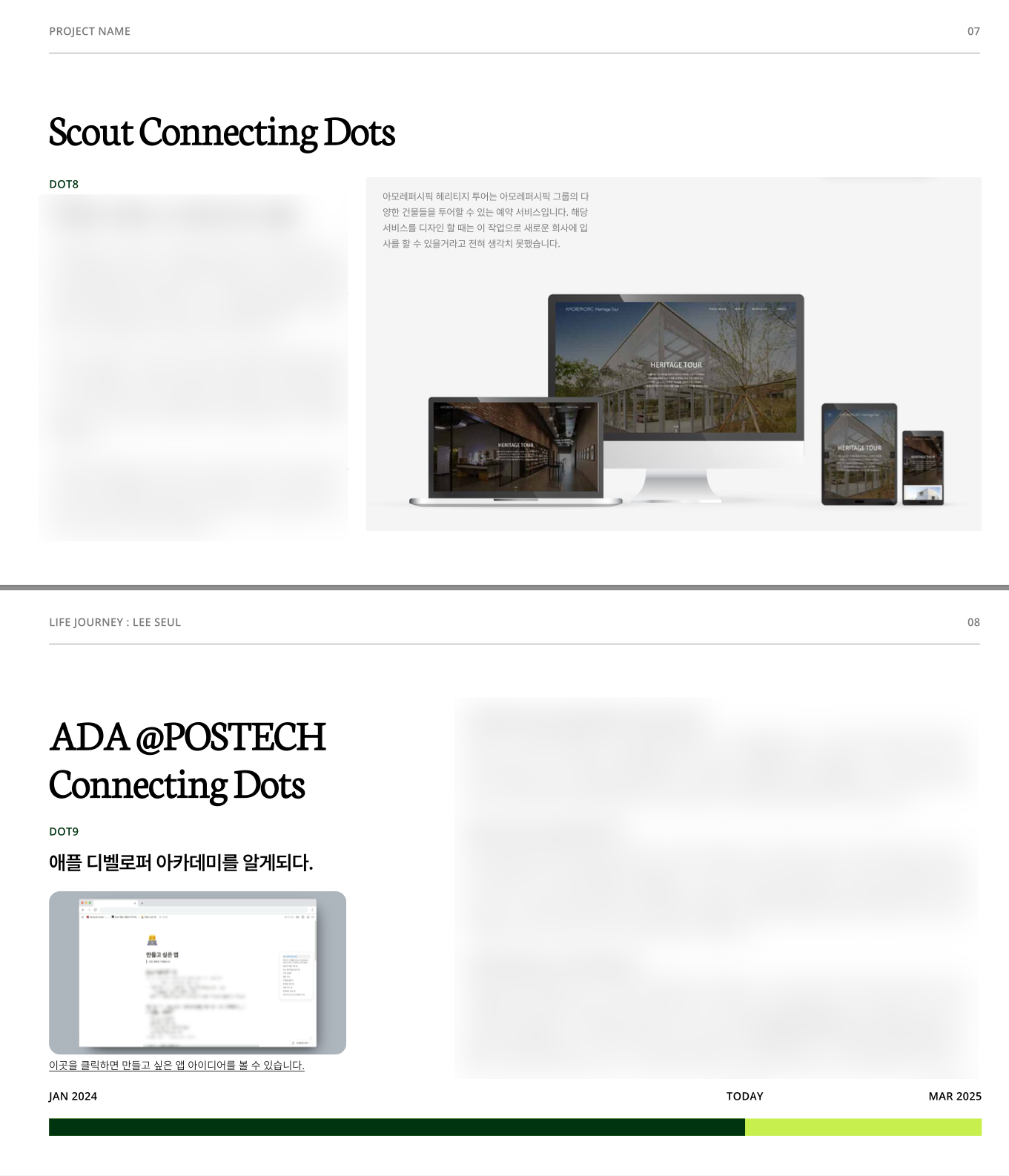 라이프저니란 지금까지 내가 살아오면서 영향을 받았던 인생의 변곡점에 대해 자유롭게 표현하는 문서로 이걸 작성하면서 내 인생을 주마등처럼 돌아보게 되었다. 나는 내가 어떤 계기로 디자인을 시작하게 되었는지 거슬러 올라가서 생각해 봤더니 꽤 어렸을 때 이야기부터 시작하게 되었다. 그리고 인생에는 항상 좋은 순간만 있는 것이 아니기 때문에 나의 어두웠던 시절까지 가감 없이 내용을 적었다. 그렇기 때문에 나만의 회복탄력성에 대해서 보여줄 수 있었으며 이후 내 삶이 어떻게 변화하게 되었는지 자연스럽게 이어지도록 스토리텔링을 만들어나갔다.