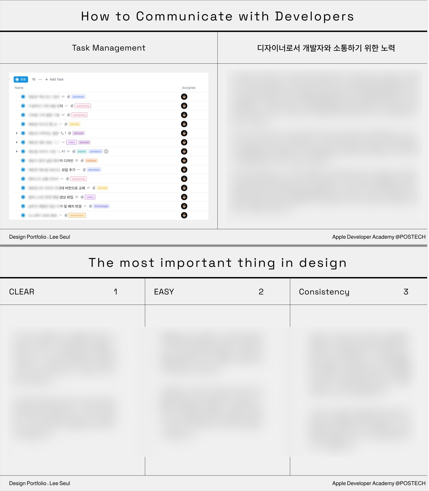 포트폴리오를 준비해야 한다는 것을 지원 안내 사이트에서 보고 당황했다. 왜냐면 이전 기수는 지원 서류에 포트폴리오가 없었기 때문이다. 하지만 그렇다고 안 할 수는 없으니 내가 이전에 작업한 것들을 토대로 나를 어필할 수 있는 포트폴리오를 만들어 보기로 했다. 거기다가 5MB 이하의 파일 용량 제한도 맞춰야 한다니.(결과물이 더 큰 용량이라면 Dropbox로 제출해도 되지만 웬만하면 제시한 파일 크기를 맞추고 싶었다.) 내가 포트폴리오를 만들면서 처음 세운 목표는 취업할 때 만드는 포트폴리오처럼 만들지 말자였다. 대신 해당 프로젝트를 진행하면서 어떤 계기로 하게 되었으며 과정 속에서 무슨 어려움이 있었는지 어떻게 해결했는지 새롭게 배우고 알게 된 점을 이야기로 풀어내고자 하였다. 그래서 프로젝트당 한 페이지씩 구성했다. 그 말은 즉슨, 15장을 채우지 않고 마무리했다는 의미이다.