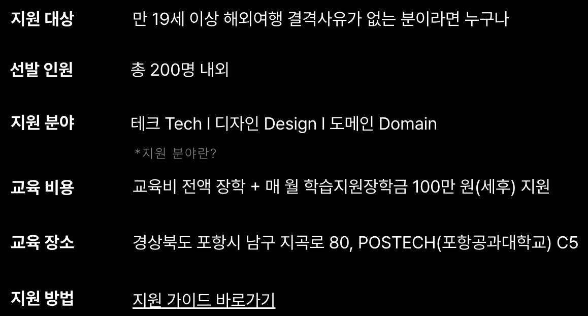 애플 디벨로퍼 아카데미(Apple Developer Academy@POSTECH)는 애플이 공식적으로 운영하는 포스텍에서 9개월 동안 진행되는 애플 생태계 맞춤형 인재를 위한 아카데미다. 2022년도 1기부터 2024년 3기까지 진행되었으며 2025년도는 4기 러너들이다. 아카데미의 프로그램을 들으려면 선발되기 위해 지원을 해야 하며 지원할 수 있는 분야는 테크, 디자인, 도메인(기획) 이렇게 세 가지 파트가 있다. 아카데미에 대해서 더 자세한 정보를 얻고 싶다면 아래 링크에서 확인해 보세요.